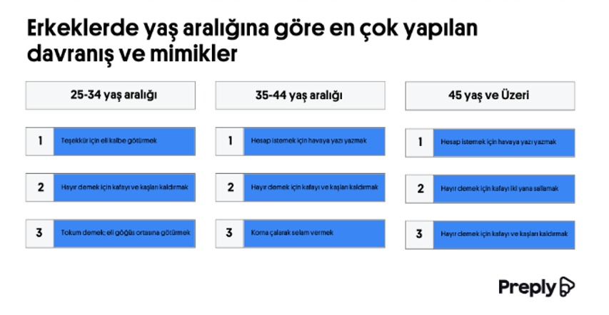 Dünya genelinde Türkler, günlük hayatlarında kullandıkları ve kültürlerinin bir parçası olan jest ve mimiklerini kullanmalarıyla ön plana çıkıyor. Peki, kültürel mirasımızın bir parçası olan hangi mimikleri sıklıkla tercih ediyoruz? 35’ten fazla dilde eğitim seçenekleri ile ortaya çıkan Almanca online ders platformu Preply sizler için araştırdı! Araştırma sonuçlarına göre, hayır demek ve nazardan korunmak için beden dili hareketlerine sıklıkla başvuruyoruz.
