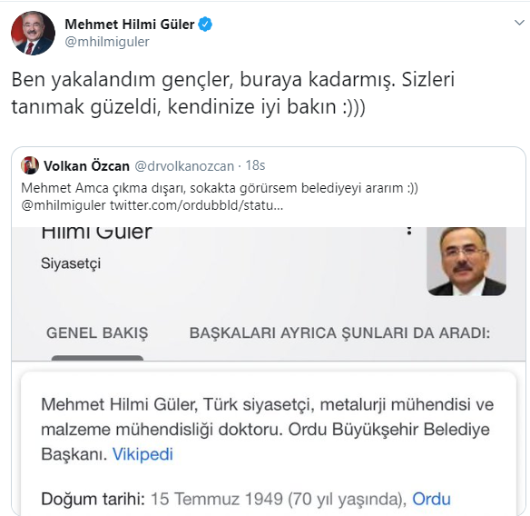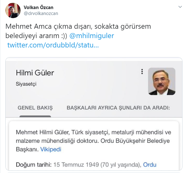 Getirilen sokağa çıkma kısıtlamasının ardından Ordu Büyukşehir Belediye Başkanı Hilmi Güler’in doğum tarihi ve biyografisini paylaşan bir sosyal medya kullanıcısı, “Mehmet Amca çıkma dışarı, sokakta seni görürsem belediyeyi ararım” diye yazdı.