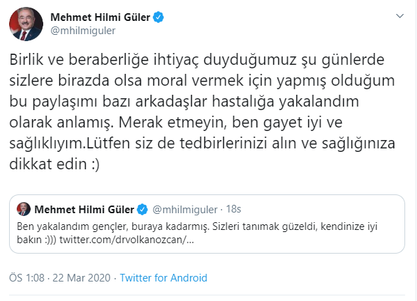 Başkan Güler, verdiği bu cevaptan sonra bazı kişilerin kendisinin de hastalığa yakalandığı sanmaları üzerine bir açıklama yaptı.
