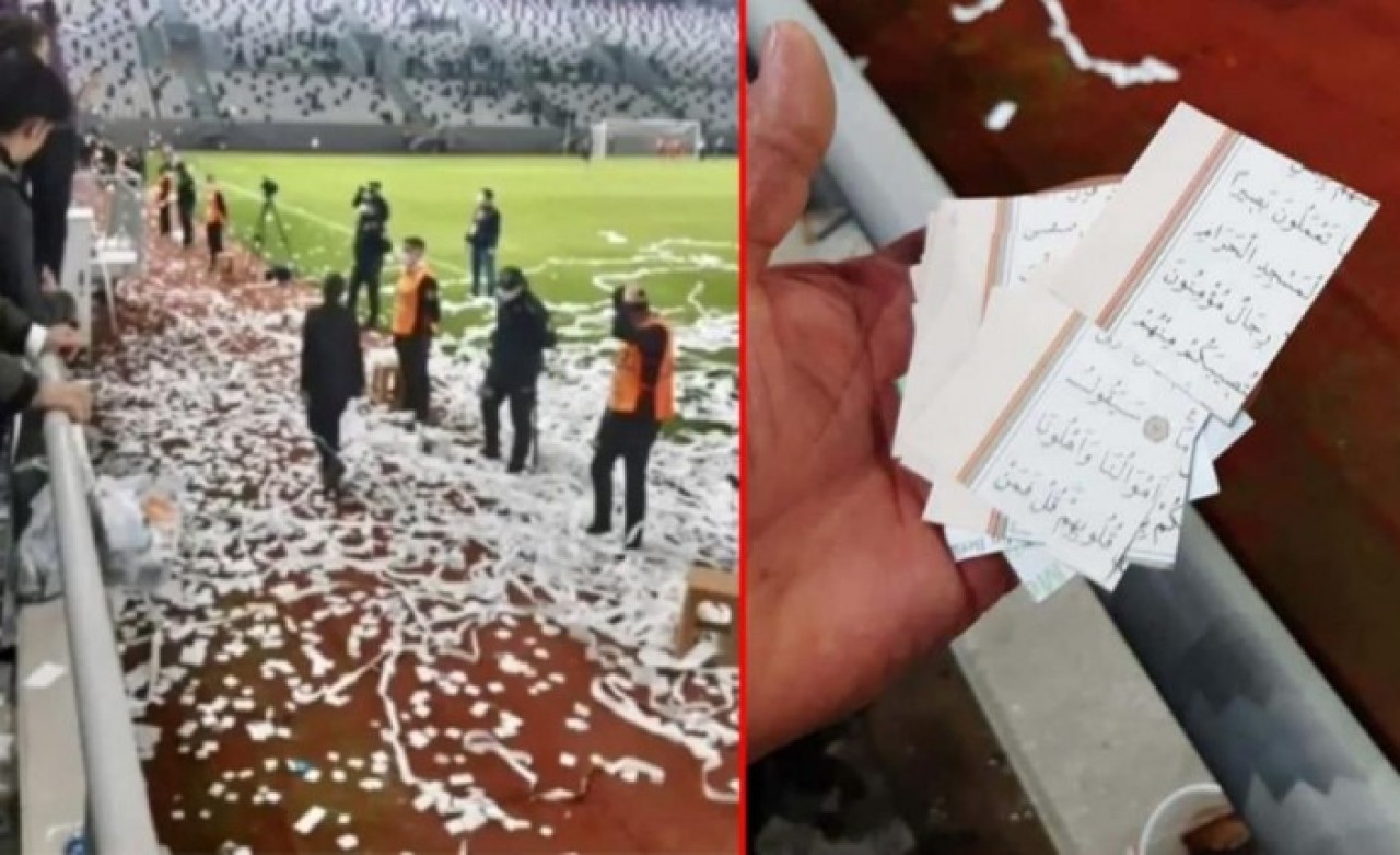 Maça giden bir vatandaşın sosyal medya hesabında paylaştığı görüntülerde binlerce Kur'an-ı Kerim ayetlerini içeren sayfalarının parça parça kesilerek yerlerden toplandığı görüldü.