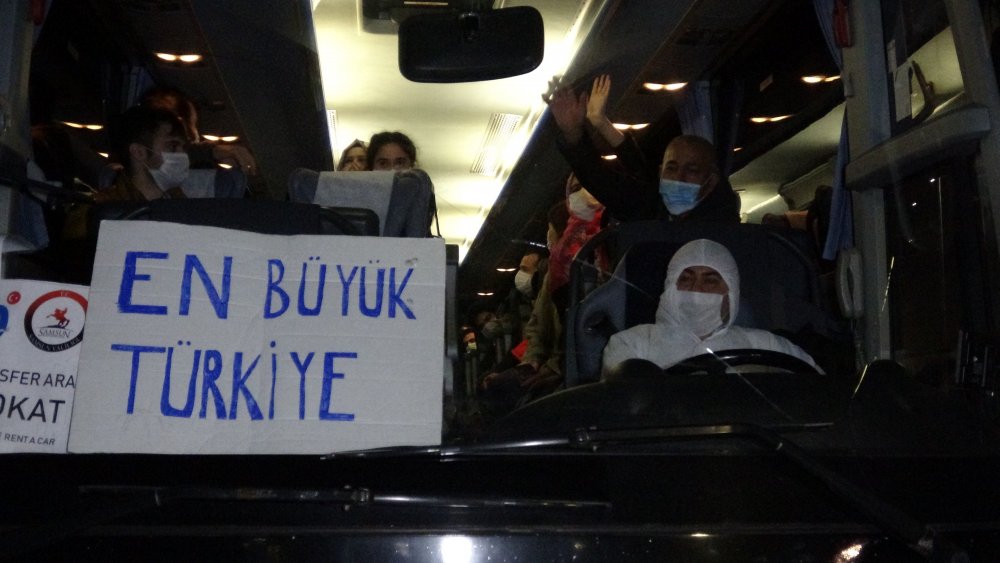 Kredi Yurtlar Kurumuna bağlı Ballıca yurduna yerleştirilen vatandaşları taşıyan otobüsün ön tarafına asılan ‘En Büyük Türkiye’ yazısı dikkat çekti.