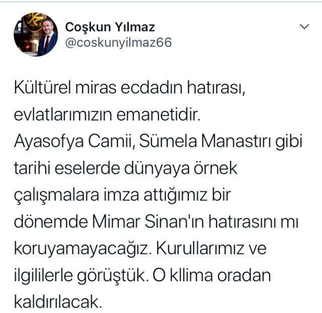 Konuyla ilgili İstanbul İl Kültür ve Turizm Müdürü Dr. Coşkun Yılmaz sosyal medya hesabından "Kültürel miras ecdadın hatırası, evlatlarımızın emanetidir. Ayasofya Camii, Sümela Manastırı gibi tarihi eserlerde dünyaya örnek çalışmalara imza attığımız bir dönemde Mimar Sinan'ın hatırasını mı koruyamayacağız? Kurullarımız ve ilgililerle görüştük. O klima oradan kaldırılacak" diye bir paylaşımda bulundu.