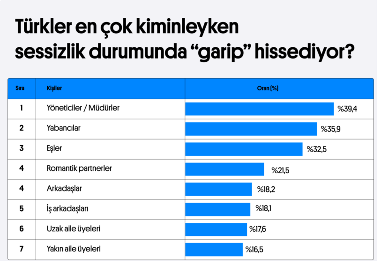 Türkler için garip sessizliklerin en rahatsız edici olduğu durumlar arasında ilk buluşmalar %38 ile öne çıkıyor. Bunun yanı sıra, klostrofobik bir etki yaratan asansörlerdeki sessizlikler de en sıkıntılı anlar arasında yer alıyor. Topluluk önünde konuşma, cenazeler ve önemli bir konuda partnerle tartışmalar da sessizliğin en fazla rahatsız edici olduğu senaryolar arasında bulunuyor.