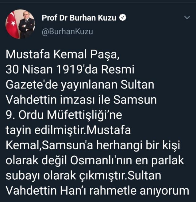 “Mustafa Kemal Paşa, 30 Nisan 1919’da Resmi Gazete’de yayınlanan Sultan Vahdettin imzası ile Samsun 9. Ordu Müfettişliği’ne tayin edilmiştir. Mustafa Kemal, Samsun’a herhangi bir kişi olarak değil Osmanlı’nın en parlak subayı olarak çıkmıştır. Sultan Vahdettin Han’ı rahmetle anıyorum.”