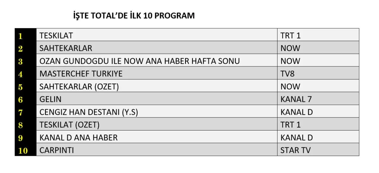 Pazar günü yayınlanan yapımlar arasında Teşkilat açık ara fark attı. Sahtekarlar istikrarını korurken, Çarpıntı'nın düşüşü kanal yönetimini harekete geçirdi. Bu tablo, izleyici tercihlerinin aksiyon ve gerilim odaklı içerikleri öne çıkardığını gösteriyor. Kanal D ve Star TV'nin dramları, sıralamada geride kaldı.