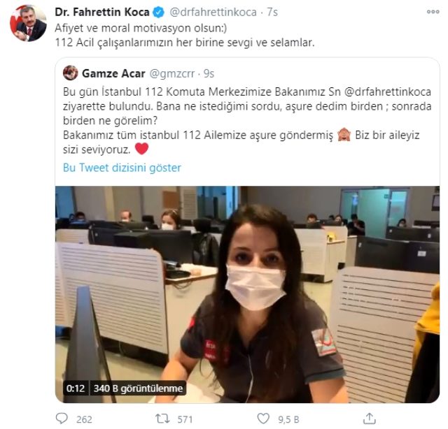 Ziyaret sırasında personelle de sohbet eden Koca, merkezde görevli Gamze Acar'ın isteği üzerine Avrupa ve Anadolu Komuta Kontrol Merkezlerinde görev yapan personele aşure ikram etti. 112 personeli Acar, Twitter'dan yaptığı paylaşımda, "Bugün İstanbul 112 Komuta Merkezimize Bakanımız Fahrettin Koca ziyarette bulundu. Bana ne istediğimi sordu, 'aşure' dedim birden. Sonrada birden ne görelim? Bakanımız tüm İstanbul 112 ailemize aşure göndermiş. Biz bir aileyiz sizi seviyoruz." ifadelerini kullandı.