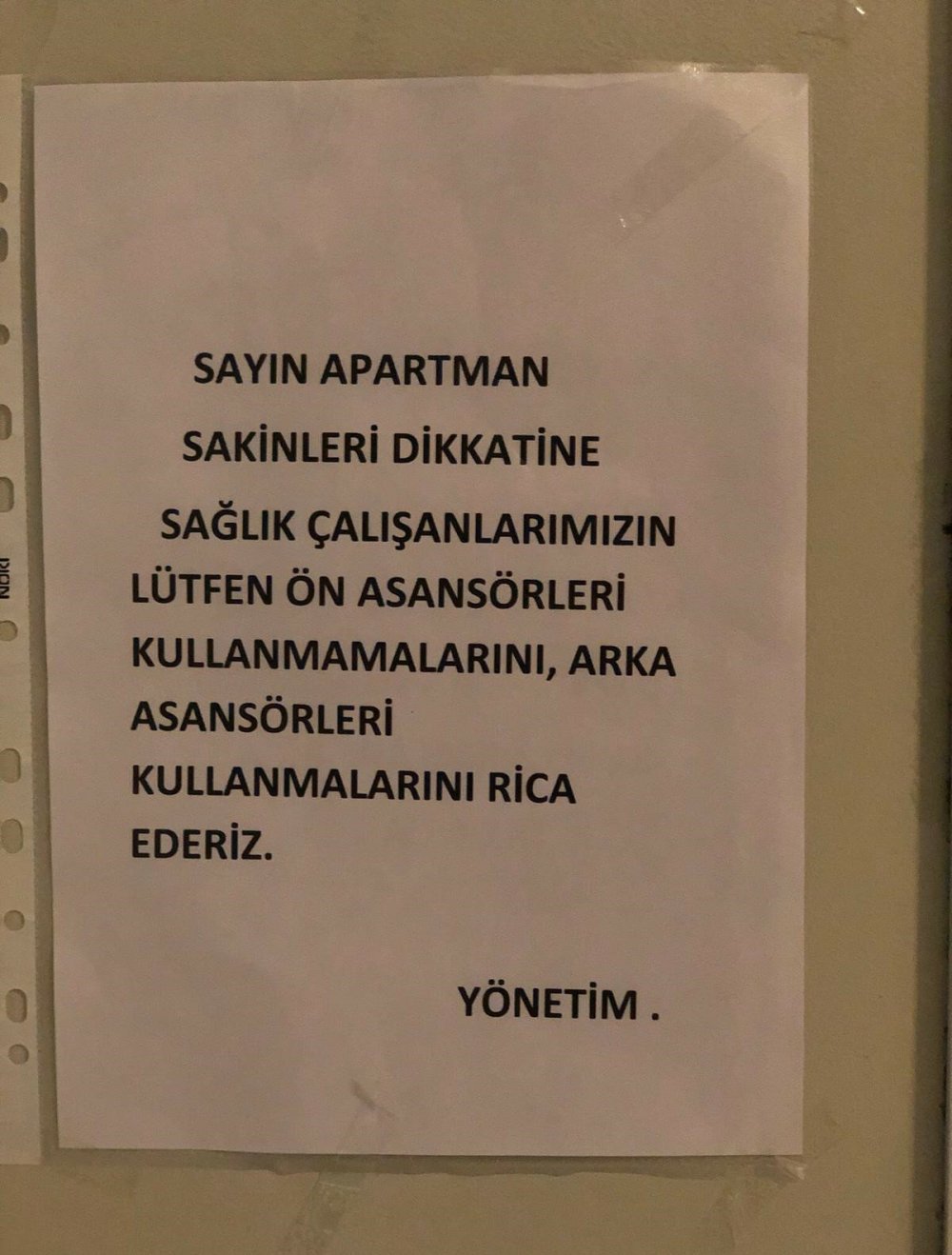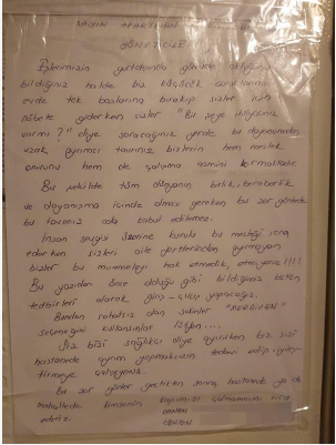Bina girişine asılan yazıda, ''Sağlık çalışanlarının ön asansörleri değil, arka asansörleri kullanmalarını rica ederiz'' denildi. Binada oturan sağlık çalışanları, kendileri için yazılan uyarı yazısının altına yaşadıkları hayal kırıklığını ifade eden duygularını paylaştıkları notu ekledi.