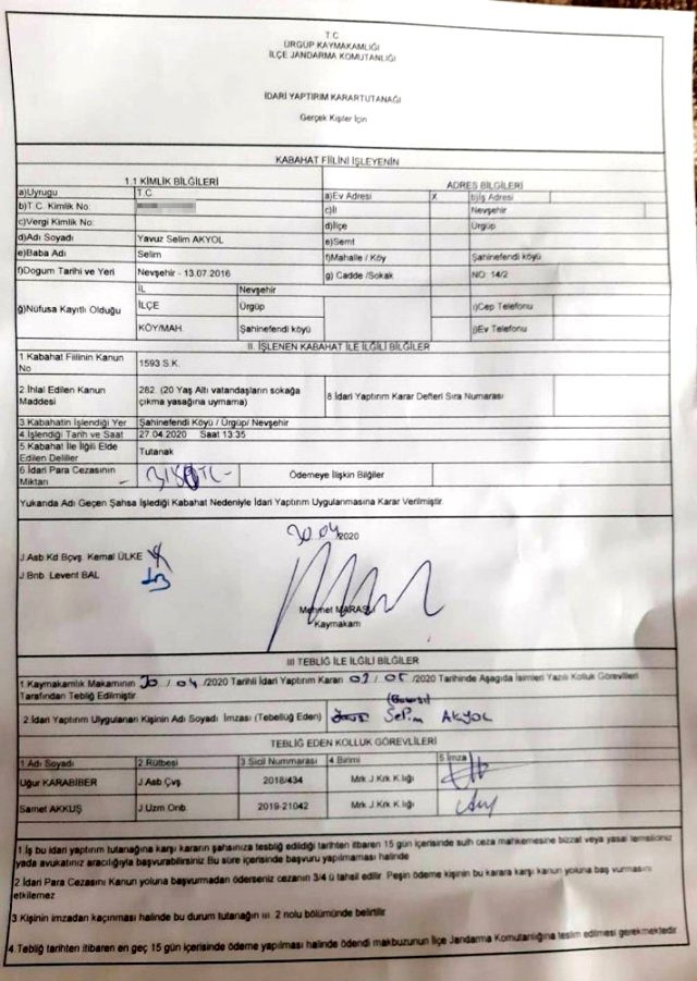 Ürgüp Kaymakamlığı tarafından evinin önünde oynayarak sokağa çıkma kısıtlamasını delen 4 yaşındaki Yavuz Selim isimli çocuğa 3 bin 150 lira para cezası kesildi.
