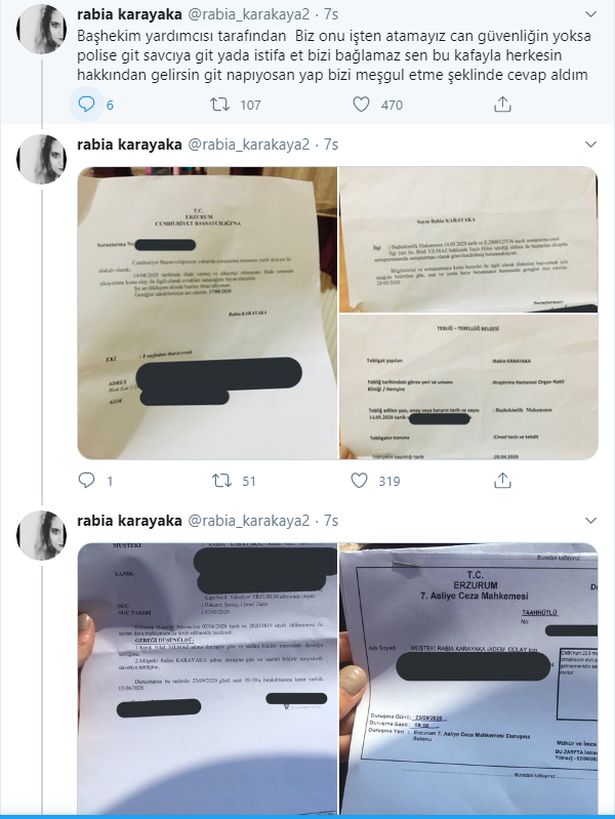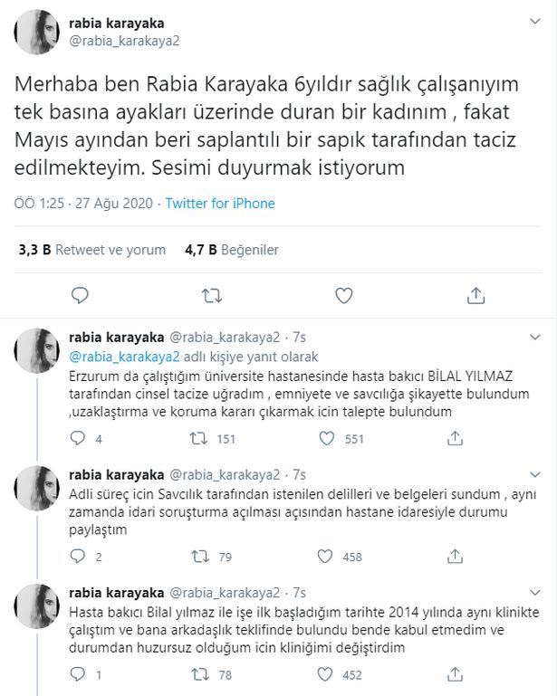 Erzurum'da bir devlet hastanesinde görev yapan sağlık çalışanı Rabia Karakaya, 2014 yılında kamuya atandı. İşe başladığı günden itibaren, aynı hastanede çalışan hasta bakıcı Bilal Yılmaz'ın cinsel tacizine maruz kalmaya başladı. Saplantılı sapık, genç kadına ahlaksız mesajlar atarken, cinsel içerikli videolar göndermeye devam etti.