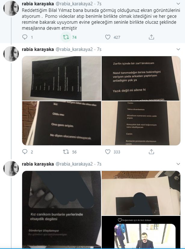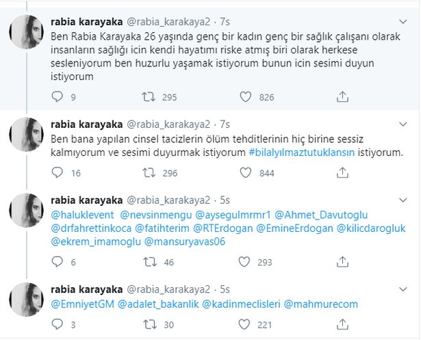 Dün gece saatlerinde attığı tweetlerle tacizi ve tacizciyi ifşa eden Rabia Karakaya'ya destek yağdı. #bilalyılmaztutuklansın etiketi tt olurken, kullanıcılar tacizcinin yakalanması için tek yürek oldu.