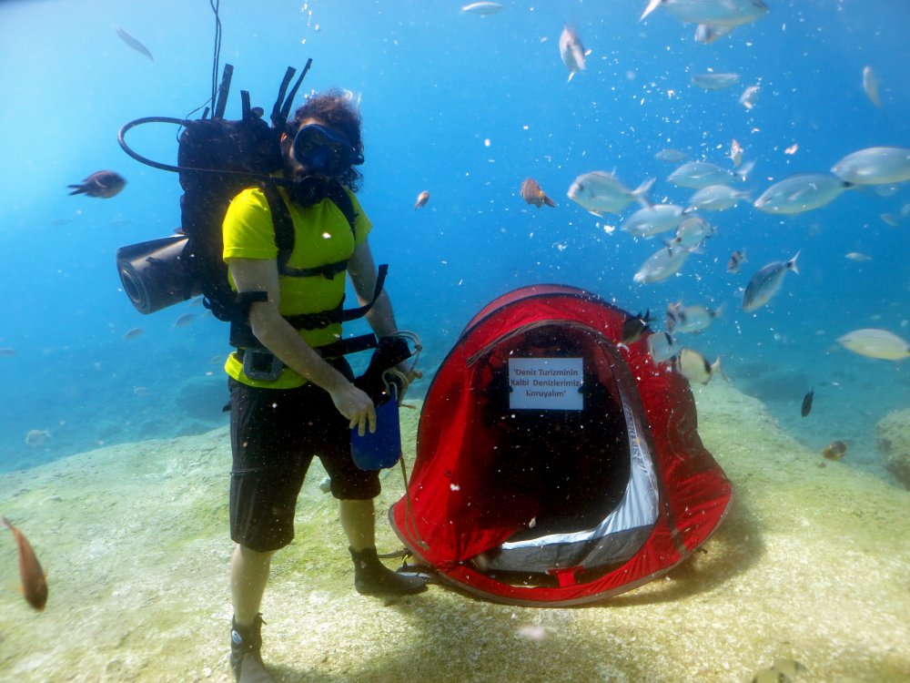 İlçedeki bir dalış okulunda dalgıç olarak görev yapan Önder Diktaş ile Fırat Can Gedik, Dalyan Koyu'nda yaklaşık 5 metre derinliğe dalarak dipte çadır kurdu. Hemen ardından farkındalık oluşturmak amacıyla çadırın önündeki çöpleri toplayan dalgıçlar, "Deniz turizminin kalbi denizlerimizi koruyalım" yazılı döviz de açtı.