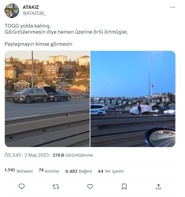 Bir sosyal medya kullanıcısı trafikte arızalanan TOGG’un fotoğrafını “Arkadaşlar fotoğraflar kardeşimin bir wp grubundan geldi. TOGG yolda kalınca görüntülenmesin diye hemen üzerine örtü örtmüşler” sözü ile paylaştı.