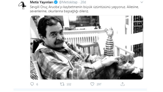 Metis Yayınları, "Sevgili Oruç Aruoba'yı kaybetmenin büyük üzüntüsünü yaşıyoruz. Ailesine, sevenlerine, okurlarına başsağlığı dileriz." mesajını paylaştı.