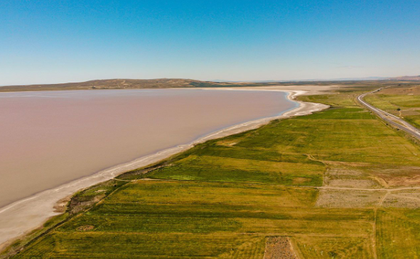 Göl, algler ve bakteriler nedeniyle pembe renge büründü.