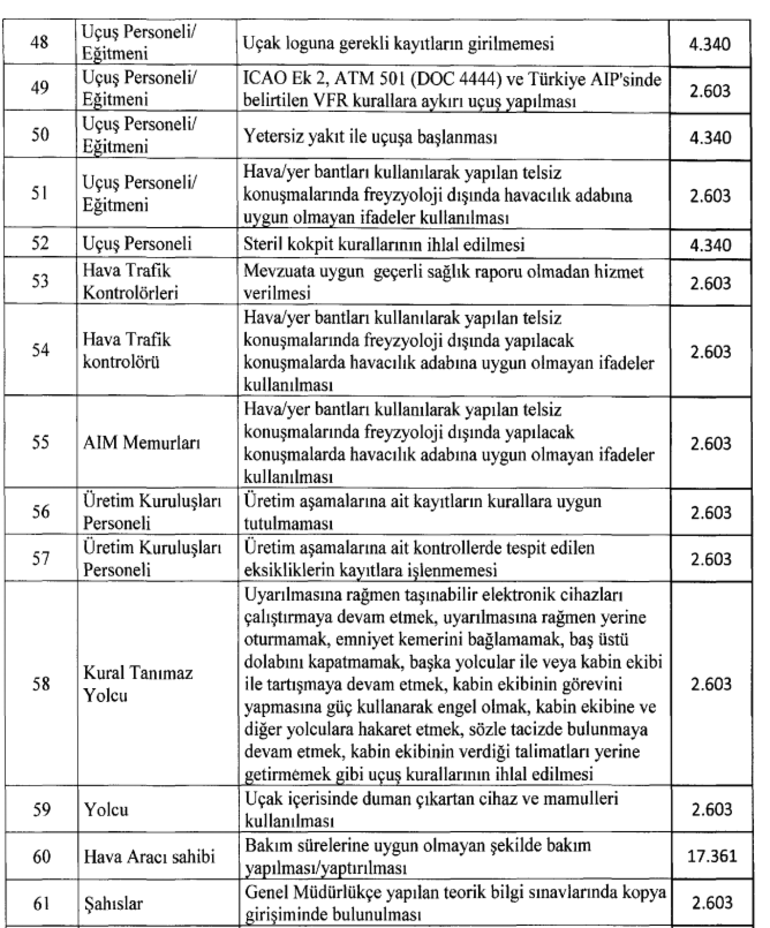 Buna göre uçakta cep telefonunu kapatmayanlar ve uyarılmasına rağmen taşınabilir elektronik cihazları çalıştırmaya devam etmek, uyarılmasına rağmen yerine oturmamak, emniyet kemerini bağlamamak, baş üstü dolabını kapatmamak, başka yolcular ile veya kabin ekibi ile tartışmaya devam etmek, kabin ekibinin görevinin yapmasına güç kullanarak engel olmak, kabin ekibine ve diğer yolculara hakaret etmek, sözle tacizde bulunmaya devam etmek, kabin ekibinin verdiği talimatları yerine getirmemek gibi uçuş kurallarının ihlal edilmesi durumunda vatandaşa uygulanacak ceza tutarı 2.603 TL olarak belirlendi.