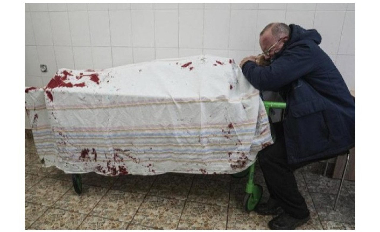 Ukrayna'nın Mariupol kentinden, genç oğlunun cesedinin başında ağlayan harap olmuş babayı gösteren bu kare, savaşın tahribatını gösteren, yürek burkan bir görüntü