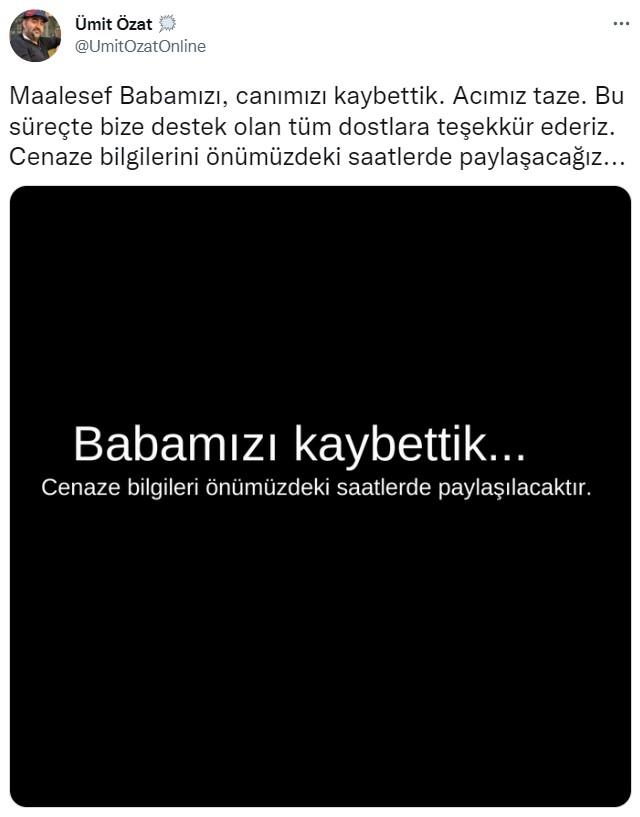 Ümit Özat'ın babası Ali Özat, tedavi gördüğü hastanede hayatını kaybetti. Özat sosyal medya hesabından yaptığı açıklamada, "Maalesef Babamızı, canımızı kaybettik. Acımız taze. Bu süreçte bize destek olan tüm dostlara teşekkür ederiz. Cenaze bilgilerini önümüzdeki saatlerde paylaşacağız..." ifadelerini kullandı.