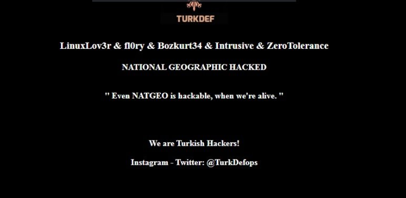 Ünlü belgesel kanalı National Geographic'in resmi web sitesi, "TurkDef" lakaplı bilgisayar korsanlarınca hacklendi. Sitenin neden hacklendiği henüz bilinmiyor.