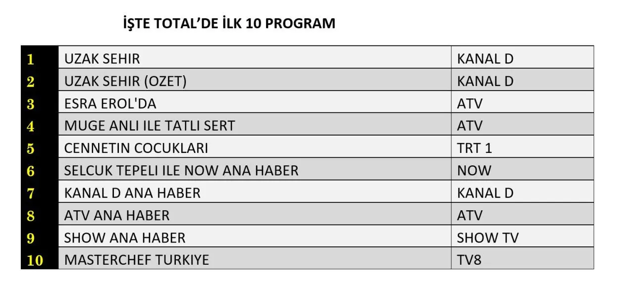 Total reytinglerde Kanal D’de yayımlanan “Uzak Şehir” birinci sırada yer aldı. Aynı dizinin özet bölümü ikinci sırayı elde ederken, üçüncülük ise “Esra Erol’da” programına gitti. AB grubunda da birinci ve ikinci sırada “Uzak Şehir” ve özet bölümü bulunuyor, üçüncü sırada ise “Cennetin Çocukları” dizisi yer aldı. ABC grubunda ilk üçte yine iki kez “Uzak Şehir” ve özet bölümü öne çıkarken, üçüncü sırada “Müge Anlı ile Tatlı Sert” programı yer aldı. "Uzak Şehir" dizisi üç ana reyting kategorisinde haftanın en çok izlenen yapımı oldu.