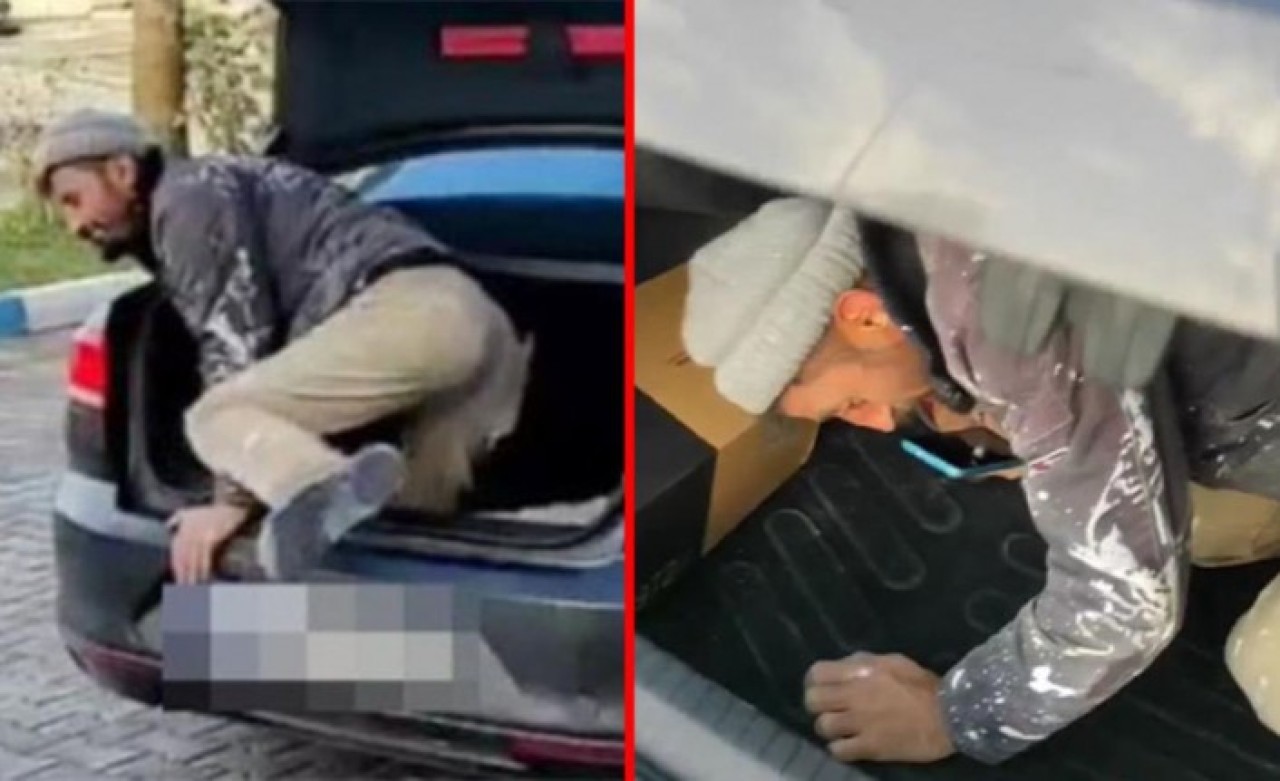 Görüntülerde, inşaatlarda boya işi yapan işveren, otomobiliyle bulvardaki yapı marketin önünde durdu. Sürücü otomobilinden inerken, çalışanı ise bagajdan çıktı. Yapı marketten ayakkabı alıp çıkan kişi ve işçisi tekrar otomobile yöneldi. İşçi yine bagaja bindi. Bulvardaki bir kişi ise işçinin girdiği bagajın kapağını kapatmasına yardım etti. O anlar ayrıca güvenlik kamerasına yansıdı.