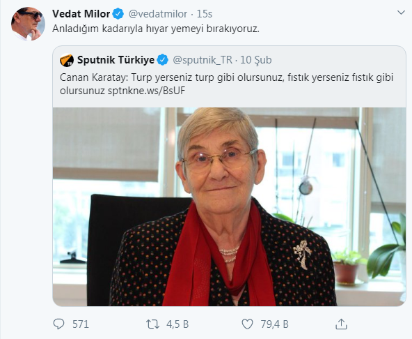 Çin’in Vuhan kentinde ortaya çıkan koronavirüsle ilgili konuşan Prof.Dr. Canan Karatay “Koronavirüs dediğimiz diğer virüslerden farkı yoktur, grip enfeksiyonudur. Bağışıklık sisteminizi güçlendireceksiniz” ifadesini kullandı. Karatay’ın “Turp yerseniz turp gibi olursunuz fıstık yerseniz fıstık gibi olursunuz” sözleri sosyal medyada gündem oldu. Yemek eleştirmeni Prof.Dr. Vedat Milor da Karatay’a göndermede bulundu.