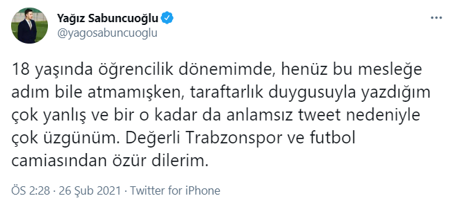 Yağız Sabuncuoğlu gelen tepkilerin ardından Twitter hesabından paylaşımda bulunarak, "18 yaşında öğrencilik dönemimde henüz bu mesleğe adım bile atmamışken, taraftarlık duygusuyla yazdığım çok yanlış ve bir o kadar da anlamsız tweet nedeniyle çok üzgünüm. Değerli Trabzonspor ve futbol camiasından özür dilerim" dedi.