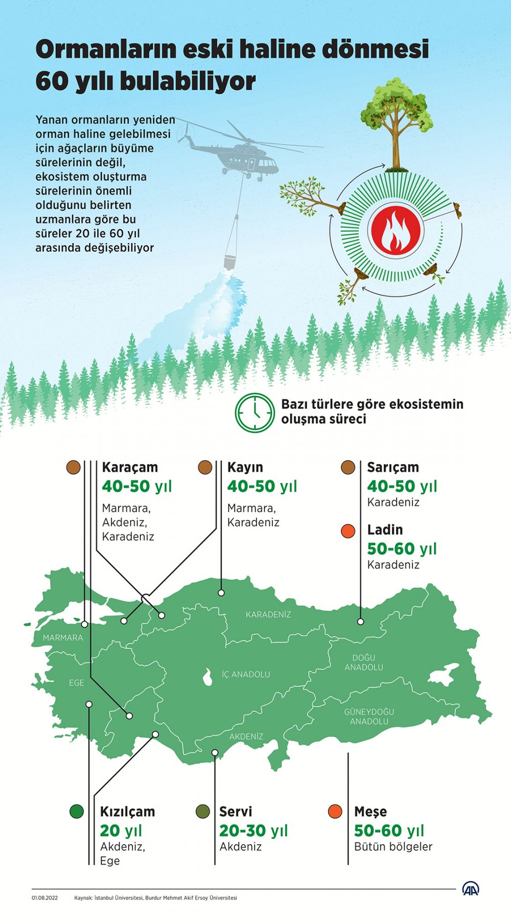 Ağaçların yeniden ekosistem oluşturma sürelerinin, türlerine göre değişkenlik gösterdiğini belirten Kavgacı, "Sarıçam ve karaçam ağaçları 40-50, kızılçam 20'li yaşlarda orman kurar. Kayın 40-50'li yaşlarda, ladin 50-60 yaşlarda, servi 20-30'lu yaşlarda sağlıklı orman diyebileceğimiz yapıya kavuşabilirler. Meşelerin daha geç, 50-60 yılda bir orman ekosistemi oluşturduğunu söyleyebiliriz. Orman, kendi içinde bileşenlerinin olduğu, bunların karşılıklı etkileşim içinde olduğu bir ekosistemdir. Ağaçlandırmayla biz sadece orada dikim yapmış oluyoruz. Orada yeniden bir ekosistemin oluşması onlarca yıl alıyor. Bu rakamlar ekosistemin meydana gelme süresi. Yoksa ağaç dikimi yaptığınızda rahatlıkla 10-15 yıl sonra bir kapalılık oluşabilir." diye konuştu.