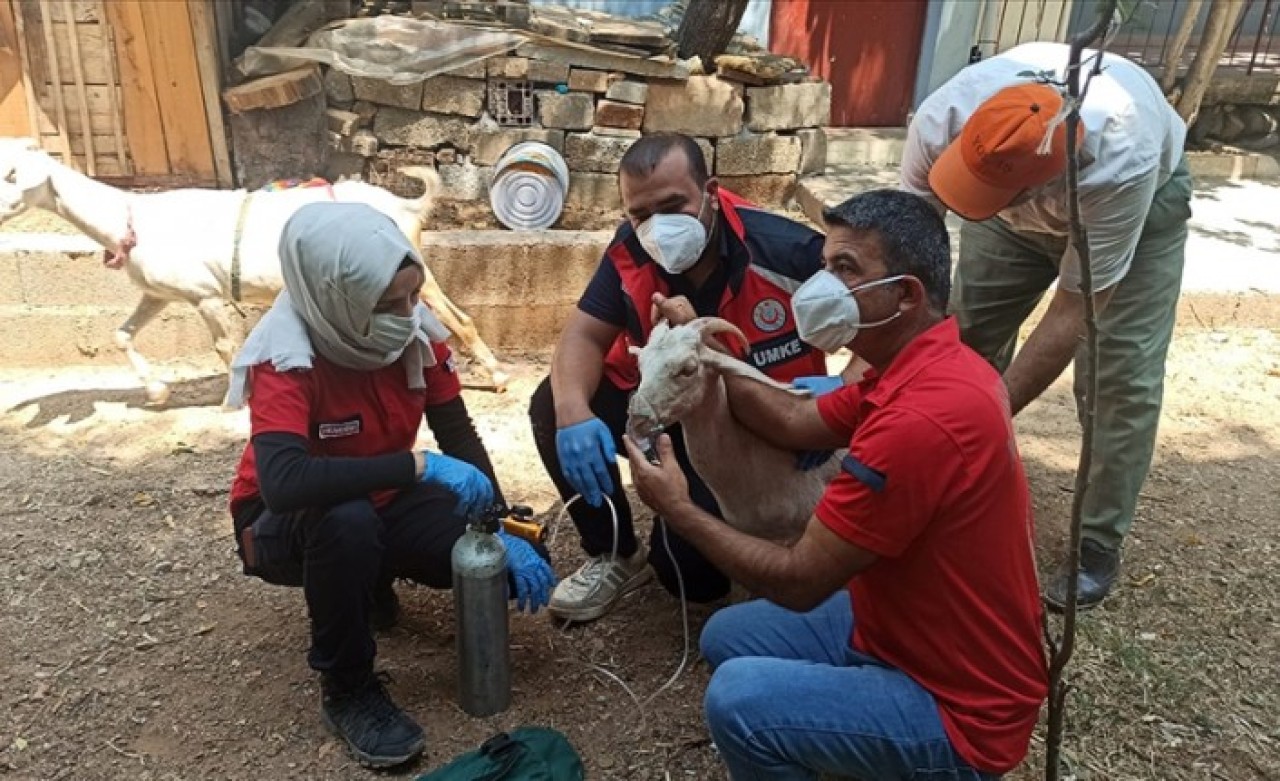 Güzelbağ Mahallesi'nde yaşayan Ramazan ile eşi Asiye Topal, orman yangınında keçilerinin dumandan etkilendiğini belirterek, bölgede bekleyen UMKE ekiplerinden yardım istedi.