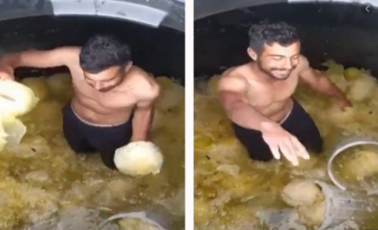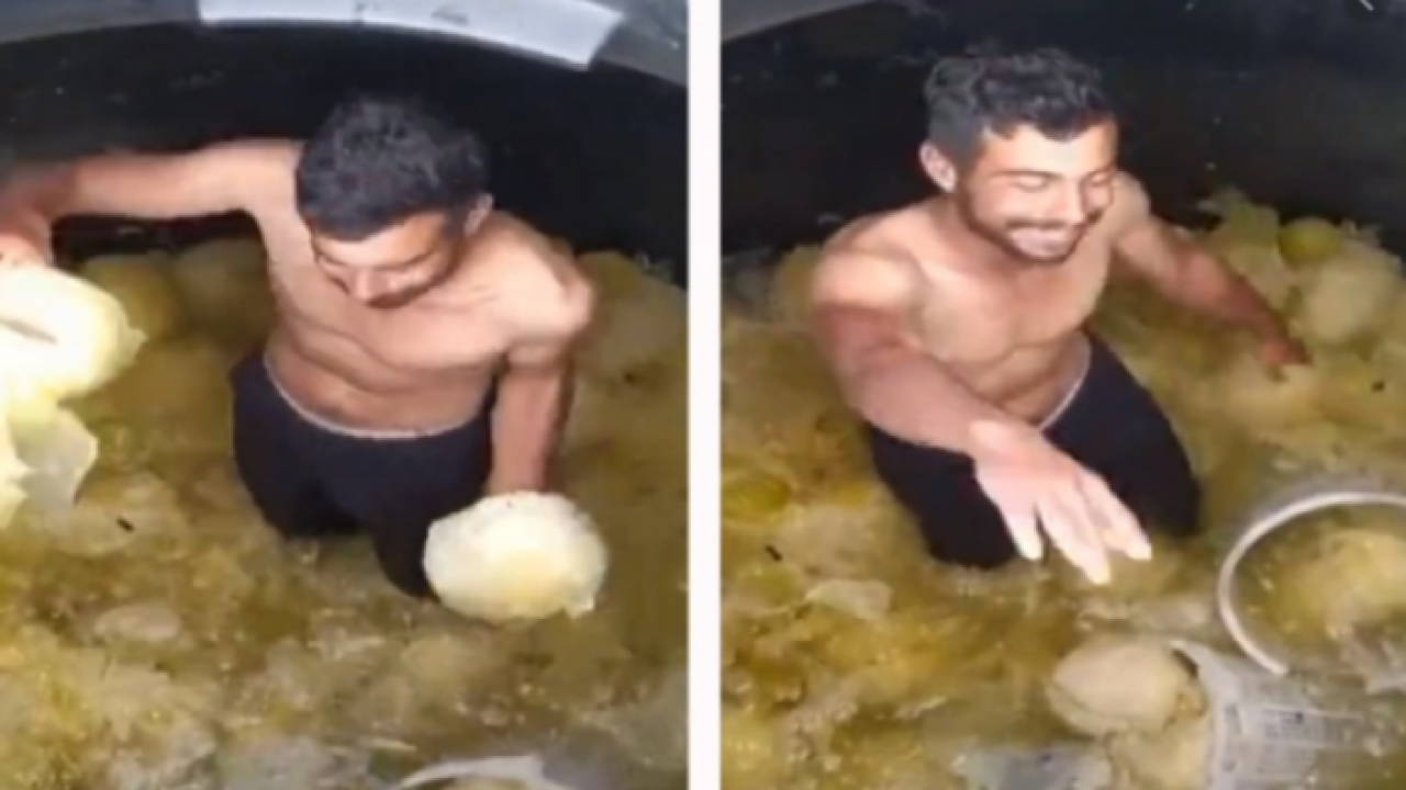 Turşu fabrikasında çalışan bir kişi, turşu tankına çıplak ayakları ve kıyafetleriyle girdi. Şarkı eşliğinde oynaya çalışan, o anları ise sosyal medya hesabından paylaştı.