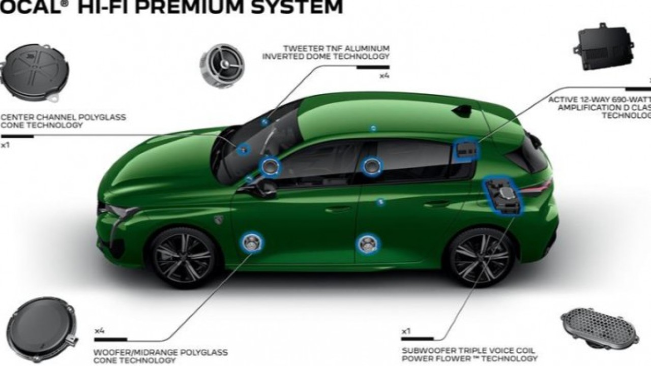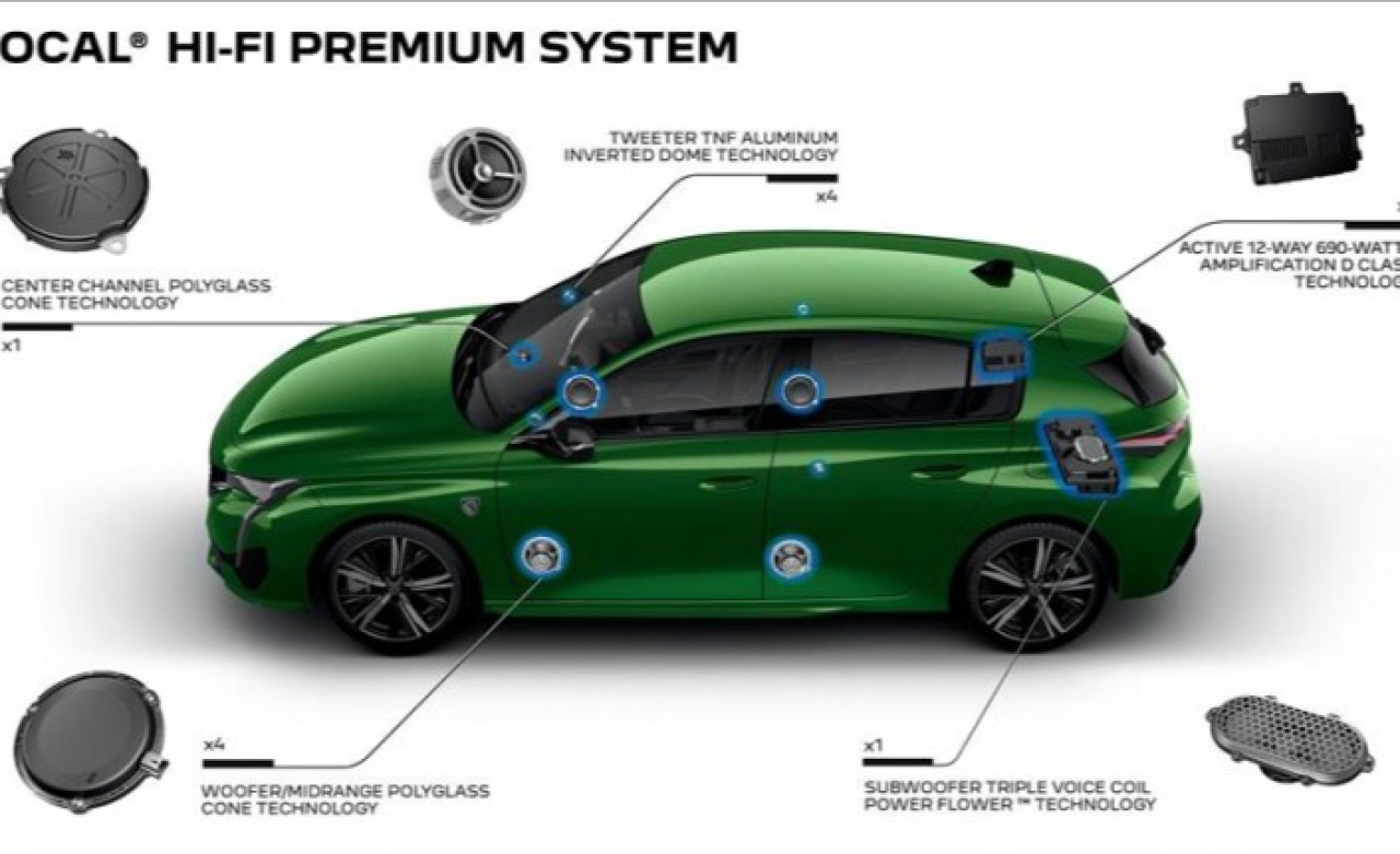 Yeni Peugeot 308’de sunulan FOCAL Premium Hi-Fi sistemi, özel patentli teknolojilere sahip 10 hoparlörden oluşuyor. 4 TNF alüminyum ters kubbe tweeter, Polyglass membranlı ve 16, 5 cm TMD (Ayarlı Kütle Sönümleyici) süspansiyonlu 4 woofer/mid, 1 Polyglass center, 1 Power Flower™ üçlü bobinli oval subwoofer’dan oluşan sistem, yeni Peugeot 308'in kabinini adeta bir konser salonuna çeviriyor.