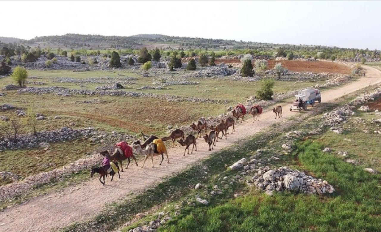 Mersin'in Gülnar ilçesindeki ormanlık alandan eşyalarını toplayarak Konya yolunu tutan Yörüklerden 61 yaşındaki Hatice Uçar, bindiği atıyla deve sürüsüne önderlik ederken kocası 63 yaşındaki Ali Uçar da traktörle su tankerlerini taşıyor.